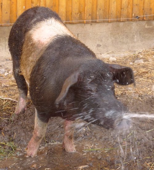 Gute Pflege gegen das Aussterben: Unserem Deutschen Sattelschweineber Harry wird bei sengender Hitze ein ausgiebiges Schlammbad beschert